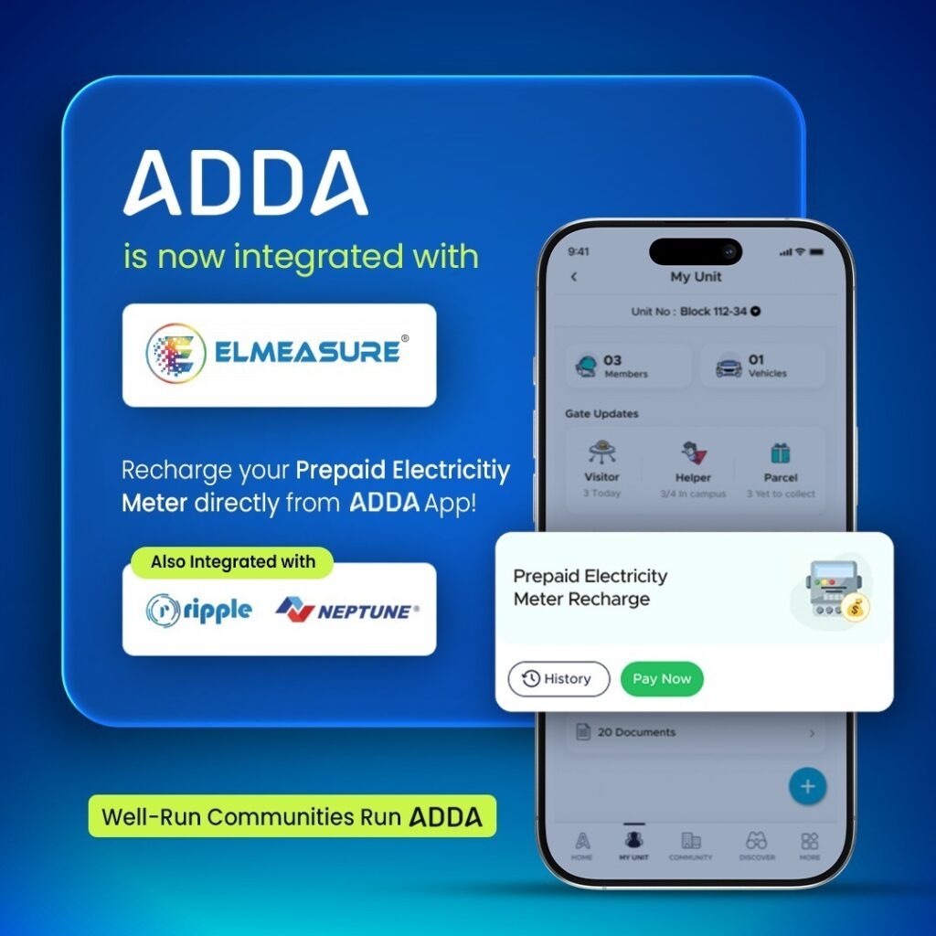 With this integration, along with paying maintenance dues and other community-related bills, you can also recharge your prepaid electricity meters and view your complete recharge history directly from the ADDA app.