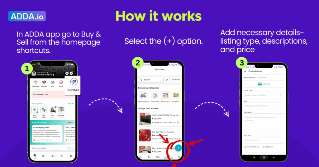 The Buy & Sell feature in ADDA is your community’s very own marketplace. Built to make buying, selling, and renting simple and hassle-free.