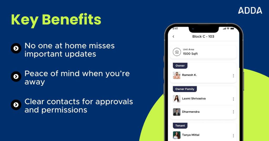 You’re travelling for work, and a pest control announcement is shared on your ADDA app. But since only your name is registered for your unit, your family members at home never receive the update.