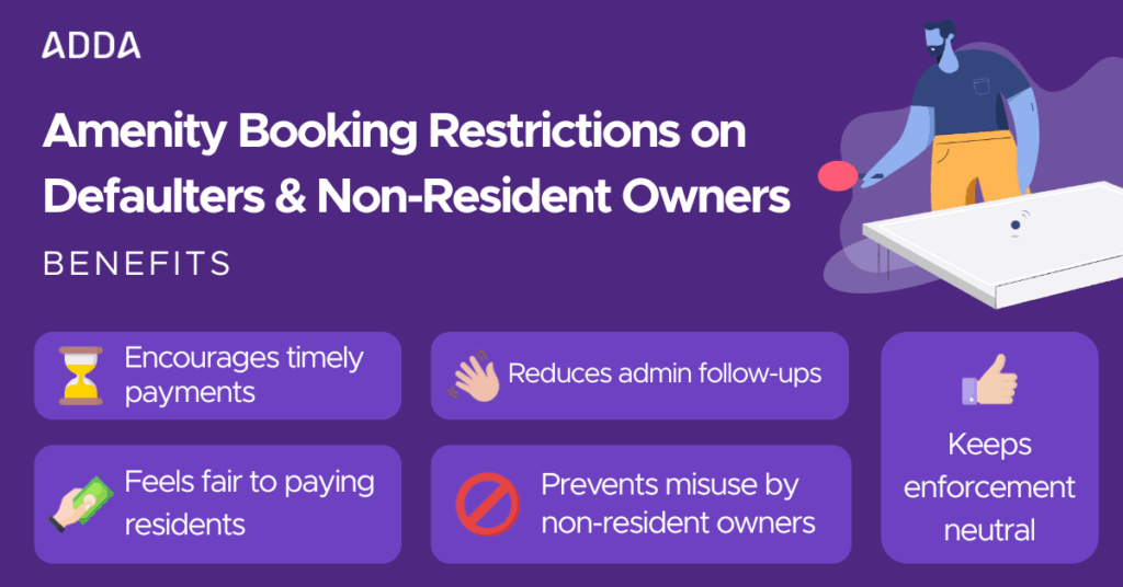 By linking amenity access to maintenance responsibility — and aligning bookings with actual residency where required — ADDA gives Management Committees a practical and balanced way to deal with chronic defaulters without affecting essential services.
