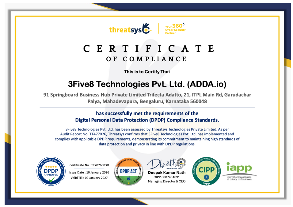 ADDA also achieved certification aligned with India’s Digital Personal Data Protection (DPDP) Act, which confirms that the platform’s policies and processes are compliant with the country’s evolving data protection laws.