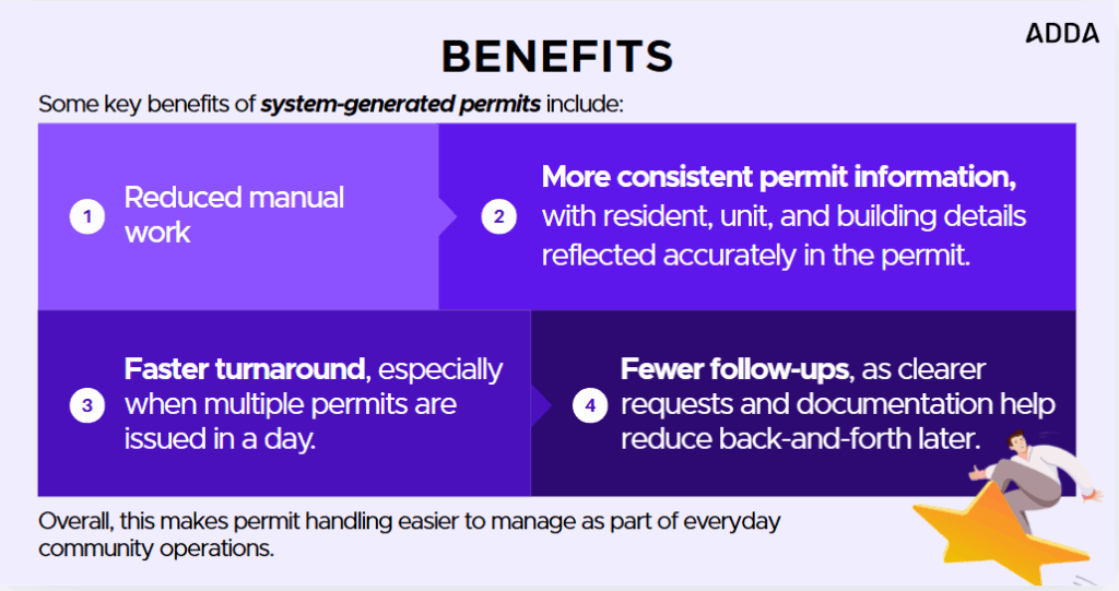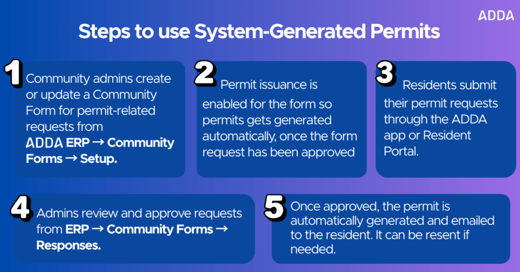 The System-Generated Permits feature in ADDA offers a more streamlined way for community admins to issue permits.