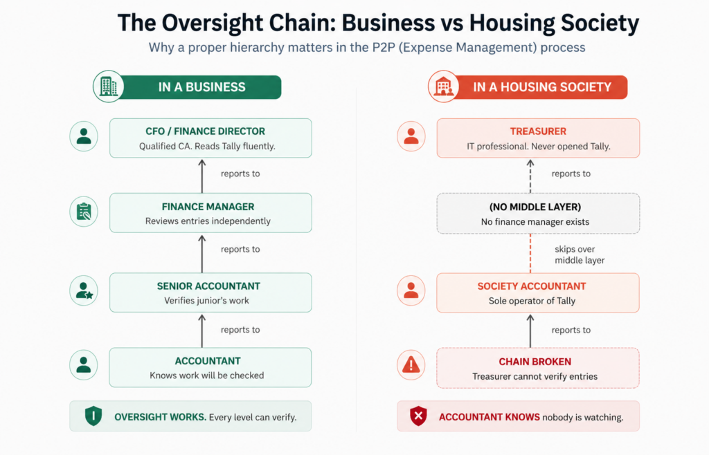 The society accountant reports to the Treasurer. And the Treasurer, in the vast majority of cases, is not a finance professional. She is an IT professional, or a retired government officer, or a business owner who got elected to the MC because nobody else raised their hand at the AGM. She is almost certainly a capable, well-intentioned person. But she has never operated Tally in her life and would not know where to begin if she wanted to verify whether an entry in the books, maintained in Tally, was correct.