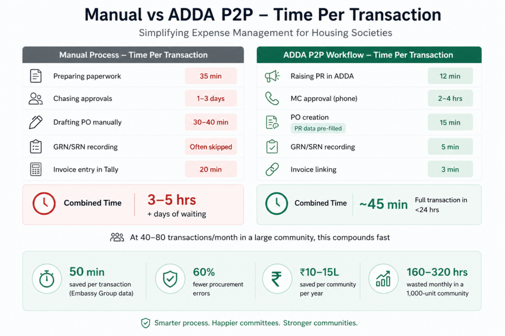Embassy Group, which manages 36 properties on ADDA, documented a 50-minute reduction in documentation time per procurement transaction and a 60 percent drop in errors after implementing the advanced purchase workflow. The estimated savings from this one process came to 10 to 15 lakh rupees per community annually.
