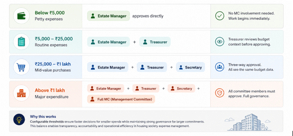 This matters because it respects everyone’s time while ensuring the right oversight for the right decisions. Committee members should not be pulled into approving a broken tap replacement. They absolutely should be in the loop when a 3 lakh generator repair is being sanctioned. The approval hierarchy does this automatically, without anyone having to decide on the fly who needs to be informed.