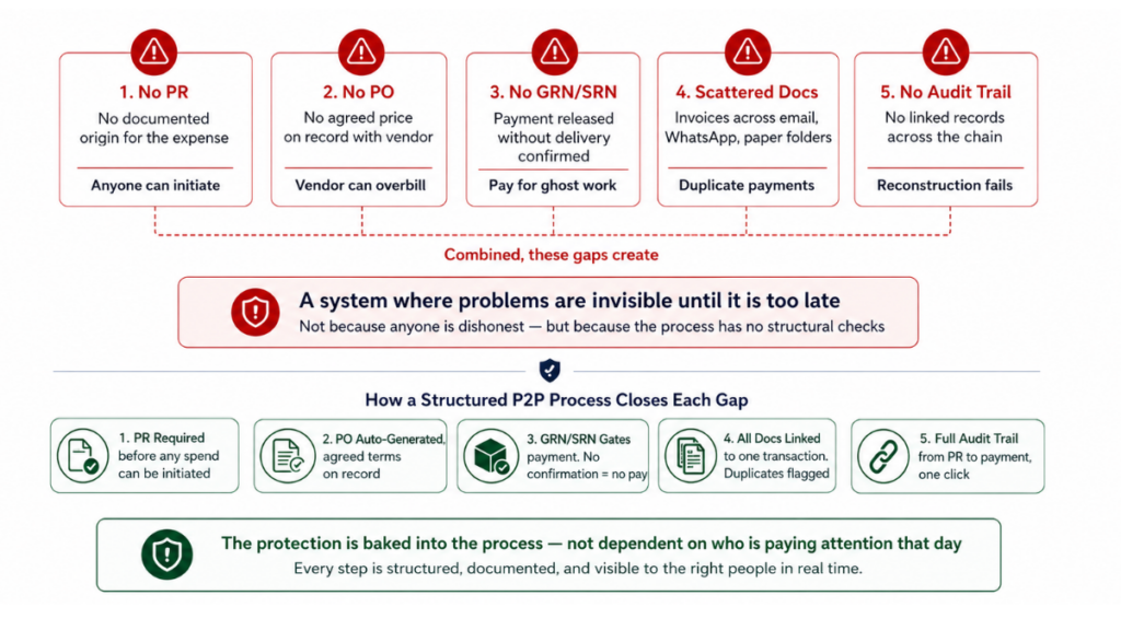- No GR/SR confirmation means payment can go out before anyone officially verified the work was done.