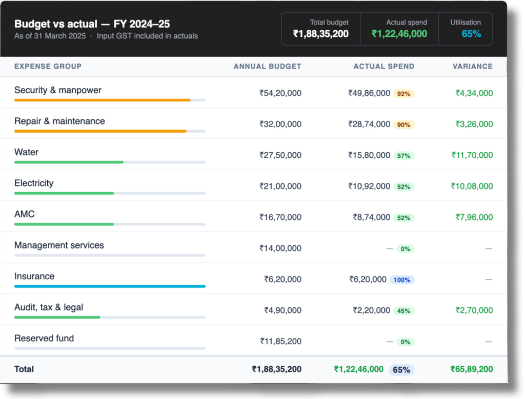 So if your AMC for a firefighting system has a budget of Rs.9,03,000 for the year and Rs.6,75,000 has already been spent, any new invoice raised against that head will surface the fact that only Rs.2,28,000 remains right there, at the point of approval. The Treasurer or approving committee member sees this before approving, not after.